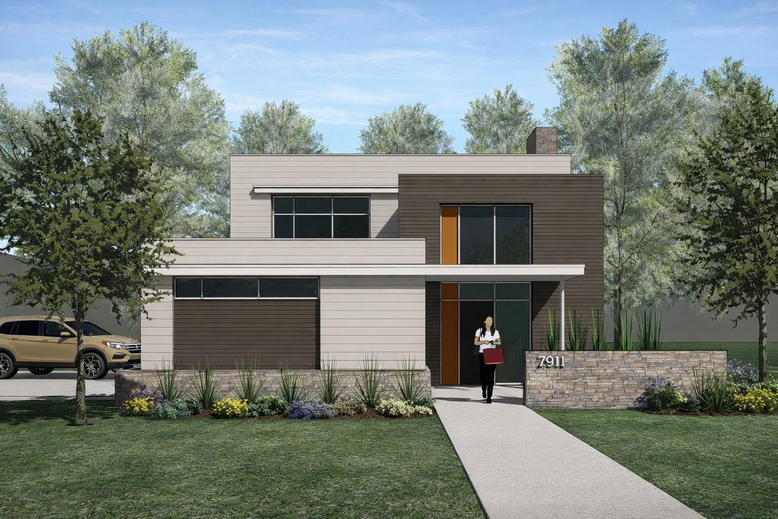 Concept design for a two-story 1,800 SF modern home with three bedrooms and three bathrooms.