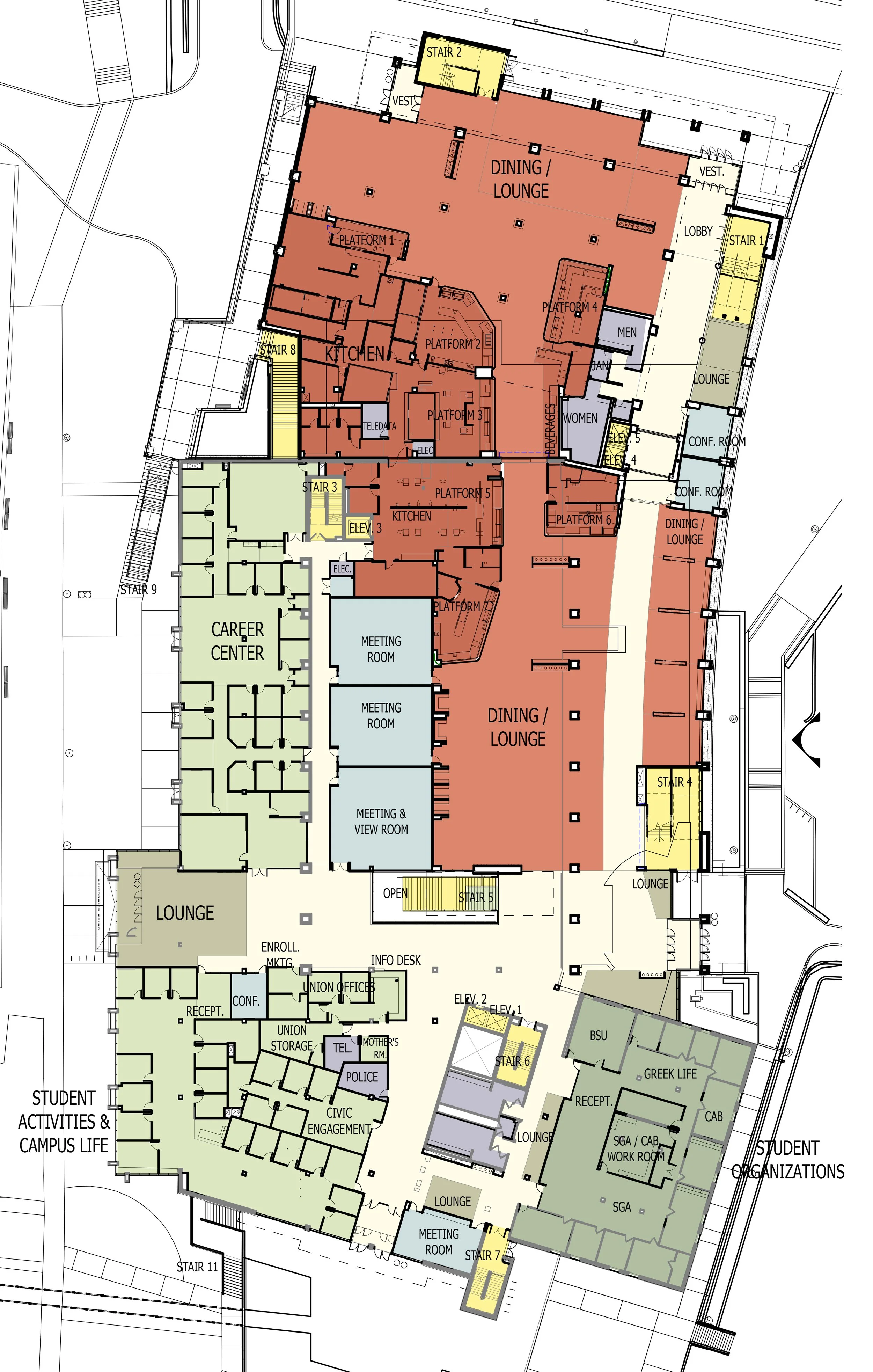 Renovation and additions to a three-story student center located in the heart of the Towson University campus. The project includes retail foodservice outlets, ballroom, meeting spaces, lounge spaces, student activities offices, student organization offices, and a career center.